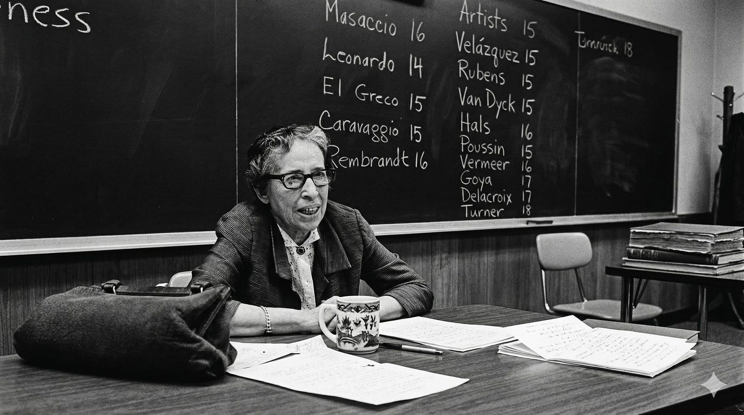 Arendt understood that most harm comes not from intention but from the absence of intention. From the shrug and the “it’s not my job.” From the desire to keep your head down so it won’t be chopped off.